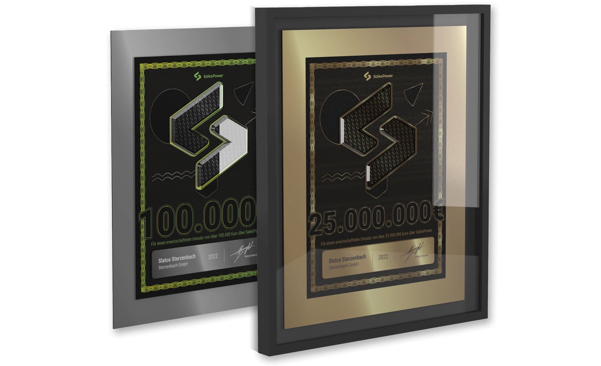 Zur Wertschätzung und Anerkennung werden SalesPower Kunden bei Erreichen des Umsatzes von 100.000 € und 25.000.000 € mit diesem hochwertigen und einzigartigen Award geehrt. Damit setzt SalesPower einen Anreiz zur Leistungssteigerung und natürlich ein Statement für die eigene Expertise.